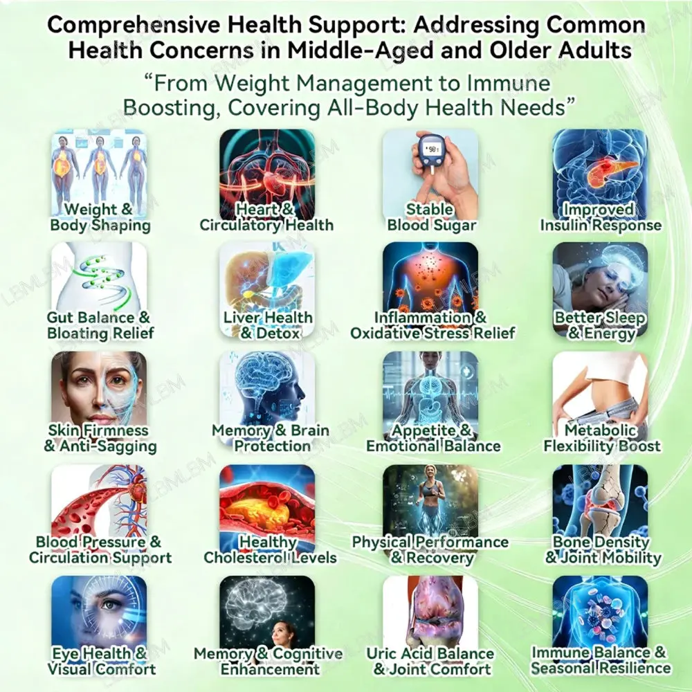 Benefits: Supports effective weight reduction and appetite regulation, stabilizes blood glucose levels, promotes cardiovascular health, reduces chronic low-grade inflammation, and helps alleviate metabolism-related fatigue.